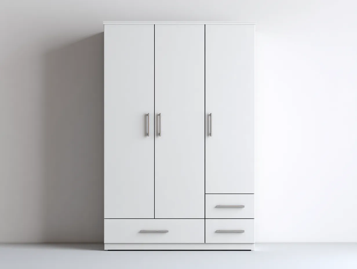 Die drei Türen sorgen für einen bequemen Zugang zum Stauraum. Ergänzende Schubladen bieten zusätzlichen Platz für Kleidung und Textilien und unterstützen eine geordnete Aufbewahrung.