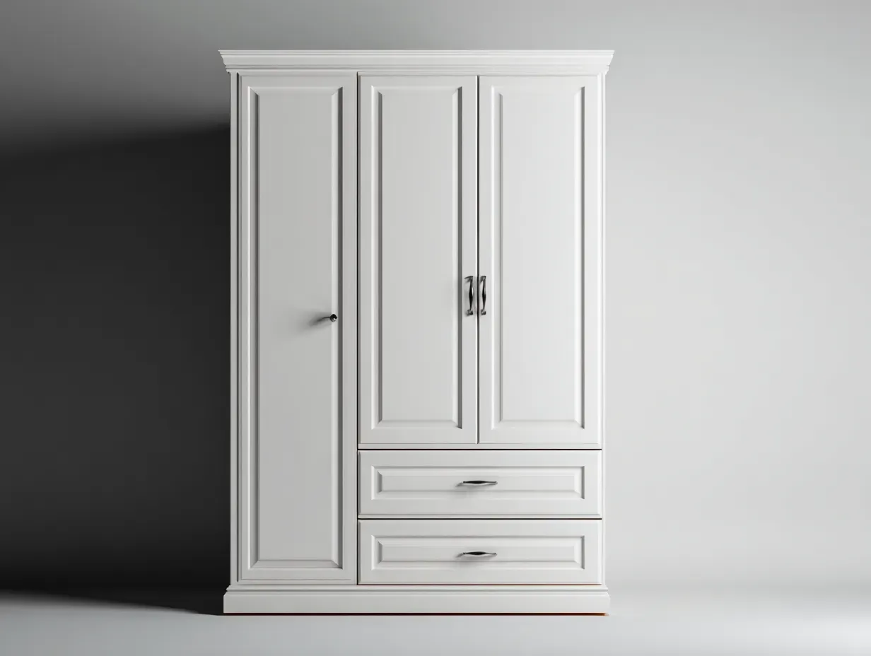 Der Kleiderschrank wird überwiegend aus Holzwerkstoff gefertigt. Das Material bietet eine stabile Konstruktion und eine gleichmäßige Oberfläche. Die weiße Beschichtung ist sauber verarbeitet und für den regelmäßigen Gebrauch geeignet.