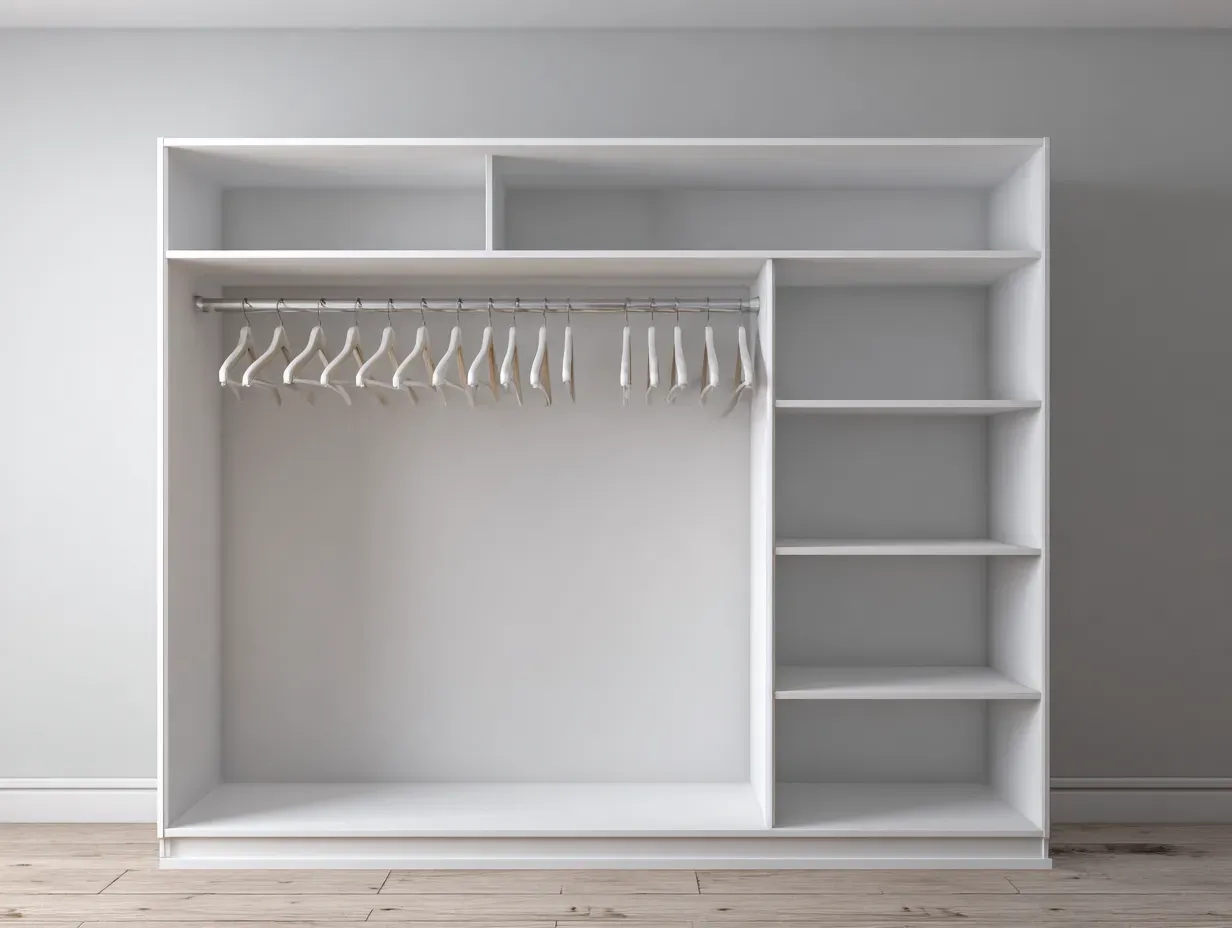 Der offene Kleiderschrank besteht aus Holzwerkstoff als Hauptmaterial. Die weiße Oberfläche ist gleichmäßig beschichtet und sorgt für eine helle und freundliche Raumwirkung. Die Verarbeitung ist stabil ausgeführt und für den dauerhaften Einsatz im Wohnbereich geeignet.