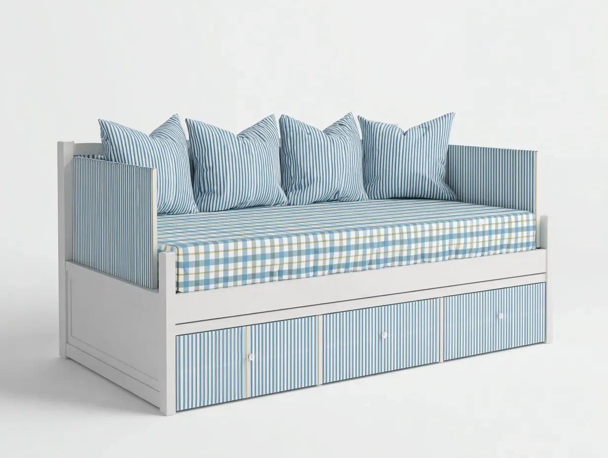 Gefertigt aus Holz und Textil. Die stabile Holzkonstruktion sorgt für eine zuverlässige Basis während die textile Liegefläche angenehmen Komfort bietet. Die Farbkombination aus Weiß und Blau verleiht dem Möbelstück eine helle und freundliche Optik. Farbe: Weiß/Blau.